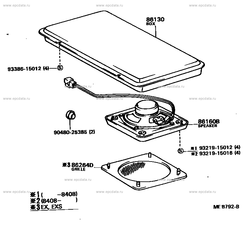 Click part number in the scheme or in the list: 86130 BOX ASSY, SPEAKER, ROOF9338615012 ** Std Part 86160B SPEAKER ASSY, REAR 9048025385 ** Std Part 9321915012 ** Std Part 9321915016 ** Std Part 86264D GRILLE, SPEAKER, ROOF |
