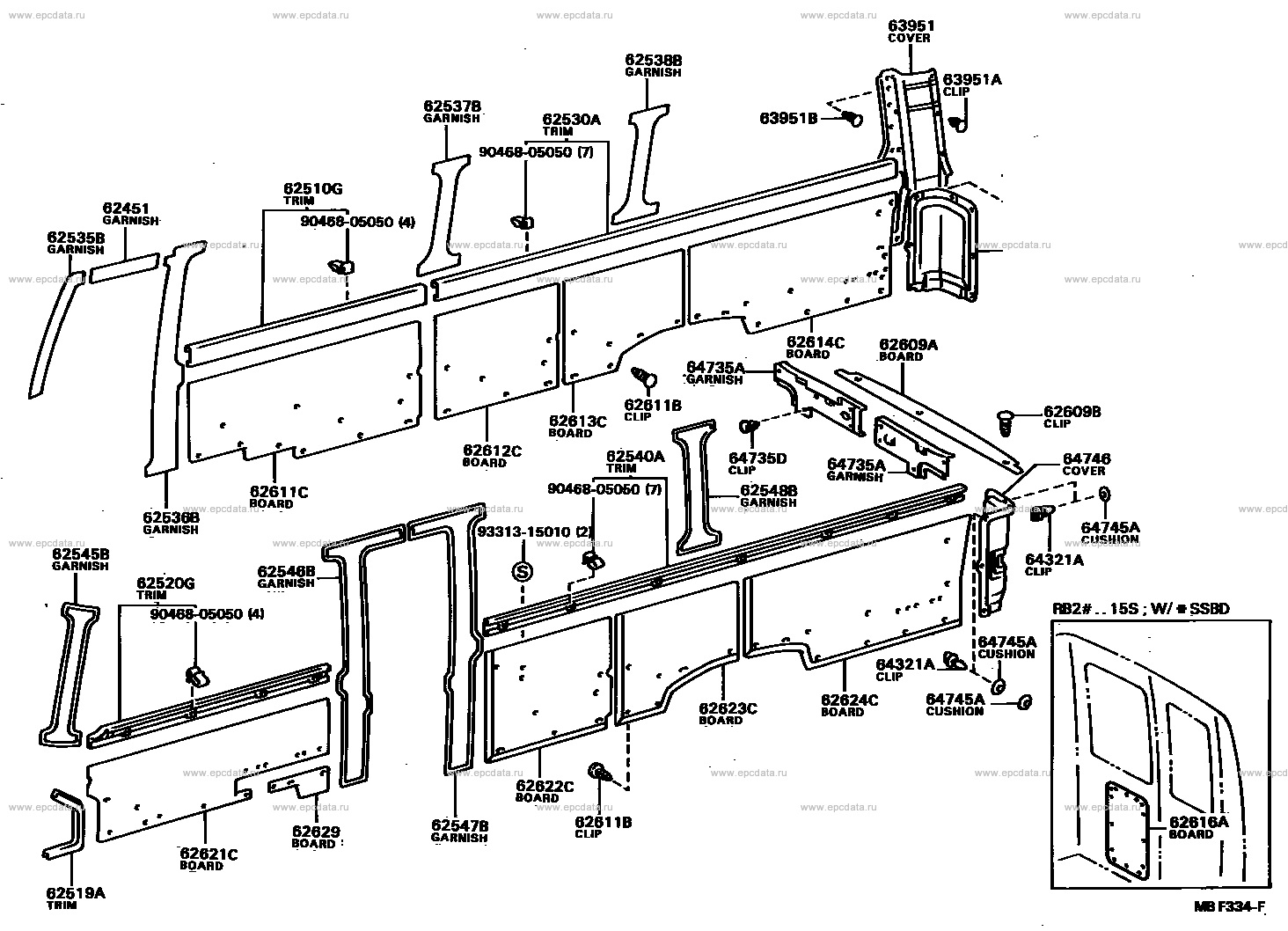 63951 COVER, COOLER PIPE 62538B GARNISH, PILLAR NO.4, RH 63951A CLIP, (FOR COOLER PIPE COVER) NO.1 62537B GARNISH, PILLAR NO.3, RH 63951B CLIP, (FOR COOLER PIPE COVER) NO.2 62530A TRIM ASSY, SIDE NO.2, RH 9046805050 ** Std Part 62510G TRIM ASSY, SIDE NO.1, RH 62451 GARNISH, ROOF SIDE INNER, RH 62535B GARNISH, PILLAR NO.1, RH 62614C BOARD, SIDE TRIM NO.4, RH 62609A BOARD SUB-ASSY, LUGGAGE PARTITION 64735A GARNISH, CENTER BACK RAIL INNER 62611B CLIP (FOR SIDE TRIM BOARD) 62609B CLIP (FOR LUGGAGE PARTITION BOARD) 62613C BOARD, SIDE TRIM NO.3, RH 62612C BOARD, SIDE TRIM NO.2, RH 62540A TRIM ASSY, SIDE NO.2, LH 64735D CLIP (FOR CENTER BACK RAIL INNER GARNISH) 64746 COVER, REAR COMBINATION LAMP SERVICE, LH 62548B GARNISH, PILLAR NO.4, LH 62611C BOARD, SIDE TRIM NO.1, RH 62536B GARNISH, PILLAR NO.2, RH 64745A CUSHION (FOR REAR COMBINATION LAMP SERVICE COVER) 9331315010 ** Std Part 62545B GARNISH, PILLAR NO.1, LH 64321A CLIP, REAR COMBINATION COVER 62546B GARNISH, PILLAR NO.2, LH 62520G TRIM ASSY, SIDE NO.1, LH 62624C BOARD, SIDE TRIM NO.4, LH 62623C BOARD, SIDE TRIM NO.3, LH 62622C BOARD, SIDE TRIM NO.2, LH 62616A BOARD, SIDE TRIM NO.6 62547B GARNISH, PILLAR NO.3, LH 62629 BOARD, SIDE TRIM, LOWER NO.1 A 62621C BOARD, SIDE TRIM NO.1, LH 62519A TRIM, SIDE LOWER WINDOW |