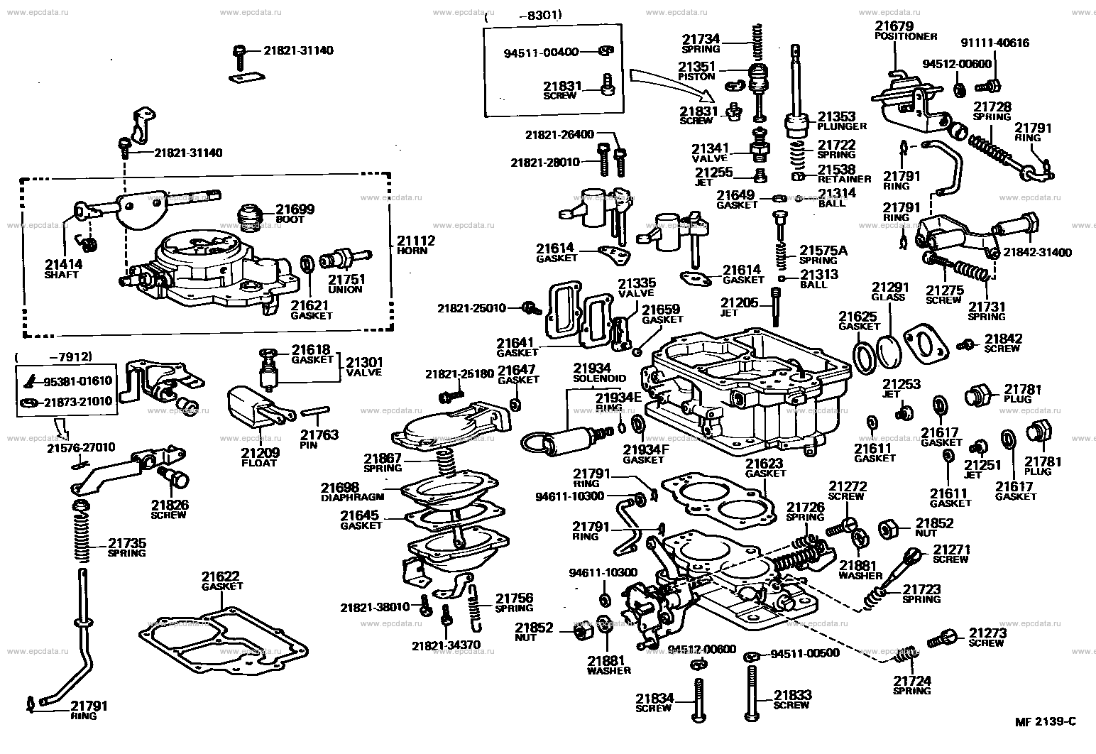 21679 POSITIONER 21734 SPRING, POWER PISTON 9111140616 ** Std Part 2182131140 ** Std Part 9451100400 ** Std Part 9451200600 ** Std Part 21351 PISTON, POWER 21831 SCREW, POWER PISTON STOP 21728 SPRING, THROTTLE VALVE RETURN 21353 PLUNGER, PUMP 21791 RING, SNAP, NO.1 (FOR CARBURETOR LINK) 2182126400 ** Std Part 21722 SPRING, PUMP DAMPING 21341 VALVE, POWER 2182128010 ** Std Part 21538 RETAINER, BALL CHECK 21255 JET, POWER 21314 BALL, STEEL, NO.2 (FOR PUMP PLUNGER) 21649 GASKET (FOR PUMP DISCHARGE WEIGHT STOPPER) 21699 BOOT (FOR PUMP PLUNGER) 21112 HORN, AIR 21614 GASKET, VENTURI 21575A SPRING (FOR STOPPER, B) 2184231400 ** Std Part 21414 SHAFT, CHOKE 21313 BALL, STEEL, NO.1 (FOR DISCHARGE WEIGHT) 21751 UNION, NIPPLE 21335 VALVE, THERMOSTATIC 21291 GLASS, LEVEL GAGE 21275 SCREW, ADJUSTING 21205 JET SUB-ASSY, SLOW 21621 GASKET, UNION NIPPLE 21731 SPRING, DASH POT OR POSITIONER ADJUSTING 2182125010 ** Std Part 21659 RING, O (FOR THERMOSTATIC VALVE) 21625 GASKET, LEVEL GAGE 21842 SCREW, SET (FOR CARBURETOR LEVEL GAGE CLAMP SET) 21641 GASKET (FOR THERMOSTATIC VALVE COVER) 21618 GASKET, NEEDLE VALVE SEAT 21301 VALVE SUB-ASSY, NEEDLE 21934 SOLENOID, THROTTLE VALVE 21647 GASKET, DIAPHRAGM HOUSING CAP 2182125180 ** Std Part 9538101610 ** Std Part 21253 JET, 2ND MAIN 21781 PLUG, MAIN PASSAGE (FOR CARBURETOR JET) 21934E RING, O (FOR SOLENOID VALVE) 2187321010 ** Std Part 21617 GASKET, MAIN PASSAGE PLUG 21763 PIN, FLOAT LEVER 2157627010 ** Std Part 21611 GASKET, MAIN JET 21934F GASKET 21209 FLOAT SUB-ASSY 21867 SPRING, DIAPHRAGM 21623 GASKET, BODY FLANGE 21251 JET, 1ST MAIN 21272 SCREW, 1ST IDLE ADJUSTING 21698 DIAPHRAGM 9461110300 ** Std Part 21826 SCREW, PUMP ARM SET 21726 SPRING, 1ST IDLE ADJUSTING 21645 GASKET, DIAPHRAGM, CAP 21852 NUT, THROTTLE LEVER SET 21735 SPRING, PUMP ARM 21271 SCREW, IDLE ADJUSTING 21881 WASHER, LOCK (FOR THROTTLE SHAFT) 21622 GASKET, AIR HORN 21723 SPRING, IDLE ADJUSTING 21756 SPRING, BACK (FOR THROTTLE SHAFT) 2182138010 ** Std Part 21273 SCREW, THROTTLE ADJUSTING 2182134370 ** Std Part 9451100500 ** Std Part 21724 SPRING, THROTTLE ADJUSTING 21833 SCREW, SET, NO.1 (FOR CARBURETOR BODY SET) 21834 SCREW, SET, NO.2 (FOR CARBURETOR BODY SET) |